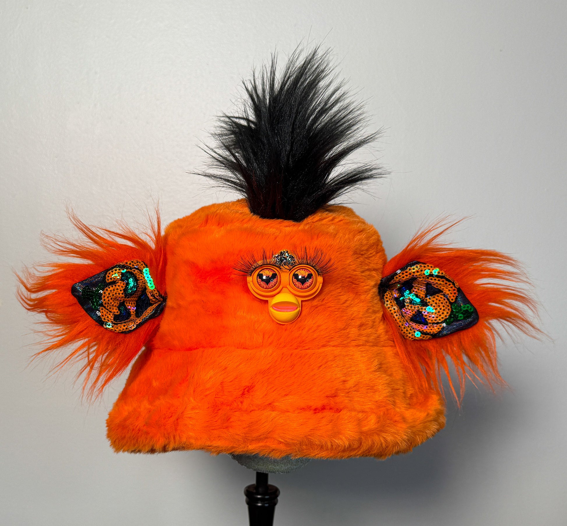 "It's fricken' bats, I love Halloween!" This pumpkin MaylahDee features custom bat eyes, sequin iridescent pumpkin ears and a mohawk."